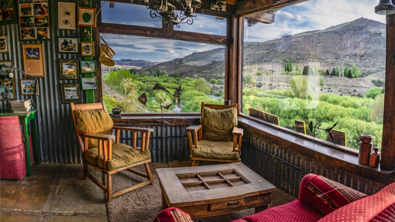 Ambos supieron hacer en las alturas esta hostería “cozzy”, vidriada, con mucha madera, obras de arte, con estufas y chimeneas, un verdadero panóptico desde el cual se ve el río Limay.