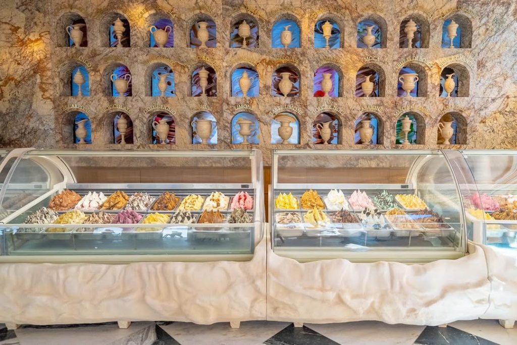 Figlio ofrece cremas heladas de elaboración propia, pastelería, chocolates y café en un marco que incluye esculturas renacentistas.