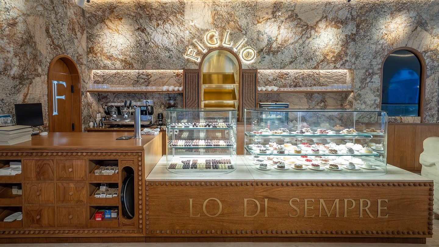 Columnas torsadas que evocan copos de helado, casetonados decorados con flores de cacao y bombones en relieve, y estatuas inspiradas en el Renacimiento conviven con jarrones de gran tamaño que exhiben frutos secos y granos de café como símbolo del valor de las materias primas. Figlio es, en ese sentido, un lugar donde la propuesta es disfrutar la gastronomía como si fuera arte.