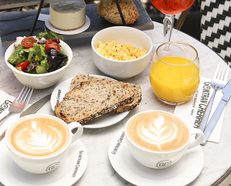 Su menú menú Le Naturel combina café o té, jugo de naranja exprimido y una tartine en pain levain con palta, queso crema y huevo poché. En versión Le Protéiné, los protagonistas son los huevos revueltos o las claras, acompañados de tostadas del mismo pan artesanal.