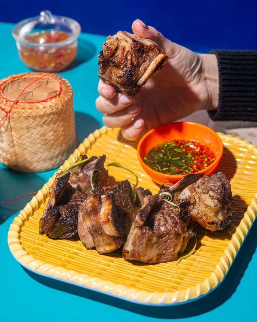Entre los imperdibles, sobresalen las costillitas de cerdo estilo vietnamita, marinadas en lemongrass y pintadas durante la cocción con un caramelo a base de salsa de pescado, que después vuelve a cubrirlas tras pasar por la parrilla. El resultado: un equilibrio perfecto entre dulzor, umami y ahumado.