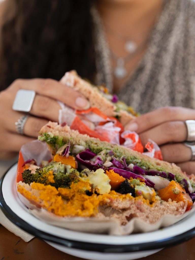 La propuesta invita a armar el sándwich a gusto, combinando ingredientes como kale, berenjenas en escabeche, cabutia asada o lentejas, siempre con la guía de quienes atienden detrás del mostrador. Todos los panes son de masa madre y se elaboran en el lugar; cada sándwich se puede acompañar con sidra patagónica, bebidas fermentadas, pomelada o limonada.