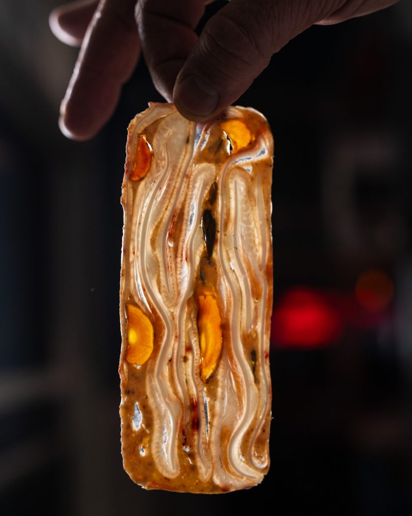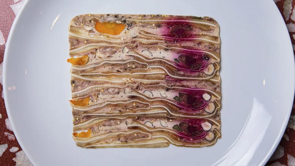 Siguiendo la filosofía de aprovechar cada corte y honrar las técnicas tradicionales, el equipo de Corte prepara este fiambre con mucha creatividad, combinando texturas y sabores. En distintas ocasiones se presentó con ingredientes como alcaparrones, avellanas, zanahoria o remolacha, que aportan matices distintos según la temporada.