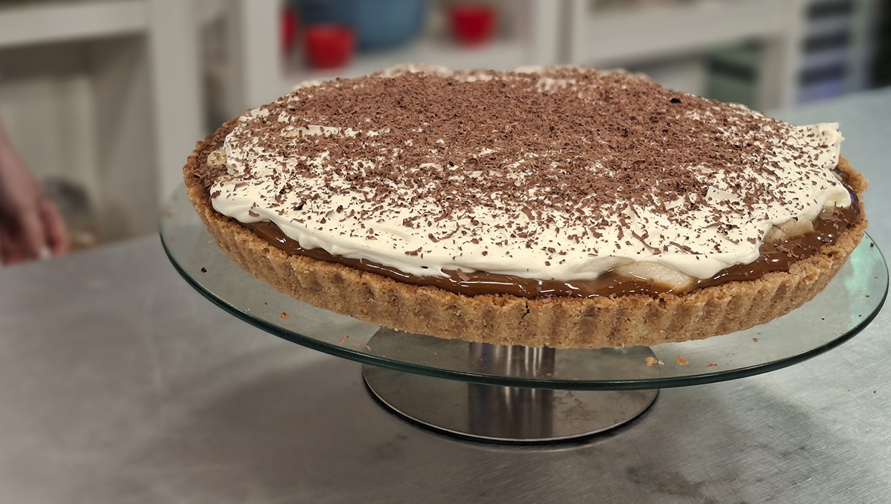 Cucinare TV, Postres Torta banoffee By Cucinare Otras Sin cocción diciembre 23, 2025 Banana y dulce de leche unidos en una torta clásica que no lleva cocción y es ideal para el verano. Ingredientes 200 g de galletitas Lincoln o similares. 100 g de manteca derretida. Jugo de 1/2 limón. 5 bananas. 500 g de crema de leche de 44% tenor graso. 50 g de azúcar impalpable. Extracto de vainilla. Chocolate para rallar. 400 g de dulce de leche tipo colonial. 400 g de dulce de leche repostero. Procedimiento 1Procesar las galletitas y añadir la manteca derretida. 2Forrar la tartera con papel manteca y las galletitas y llevar al frio. 3Unir los dos dulces de leche, cortar las bananas y sumarles unas gotas de jugo de limón. 4Colocar el dulce de leche sobre la base de la torta, luego, las bananas cortadas o enteras. 5Batir la crema con el azúcar y el extracto de vainilla. 6Decorar la torta con la crema y rallar el chocolate por encima. Sofía RacheffTorta banoffee 00:00 0 Comentarios Cancelar respuestaComentarios ...All fields are required to submit a review.Nombre ... Email ...