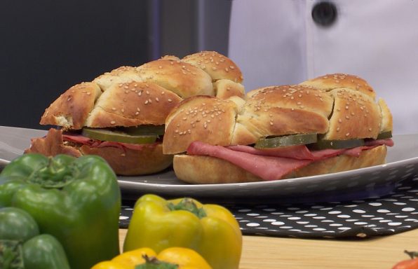 Sándwich en pan jalá de pastrón y pepinos en conserva