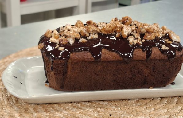 Budín de banana bañado en ganache de chocolate y nueces caramelizadas